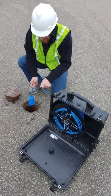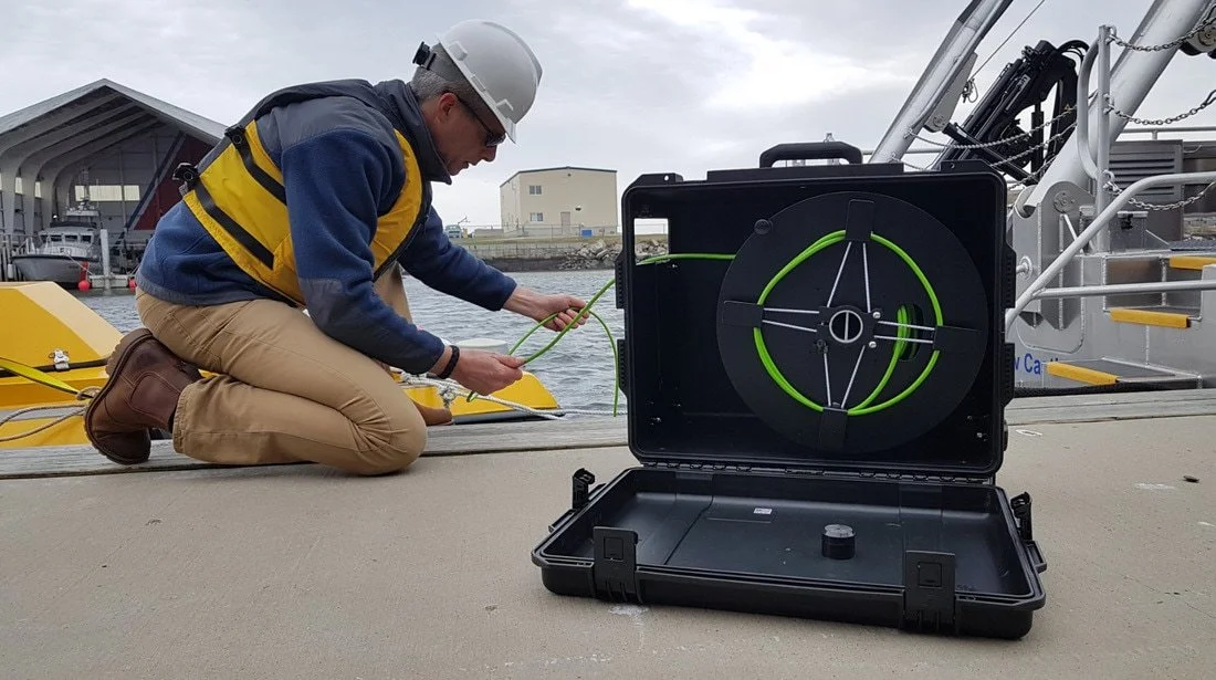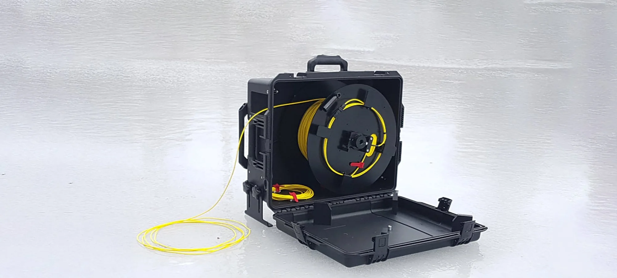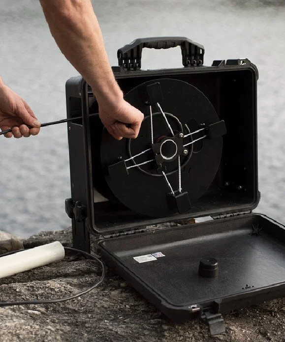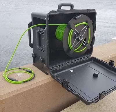 The coiling system is housed inside of a sturdy air shippable and stackable Pelican ™ Case ensuring safekeeping both in and out of use. A metal storage drum holds any cable from 1 mm fiber to 20mm multiconductor or coax and nearly everything between.