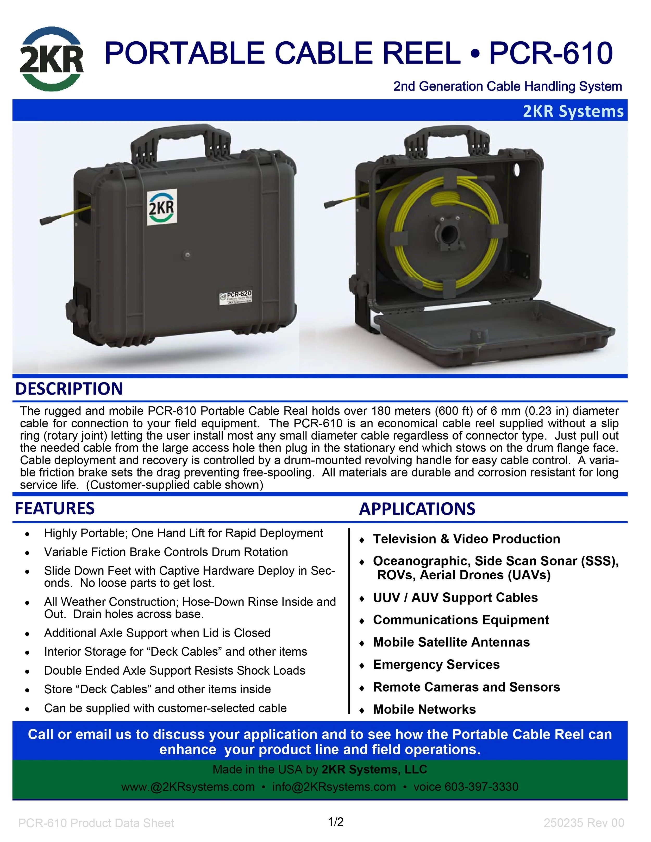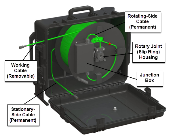 There are two families of PCRs: dynamic reels with rotary joints and storage-only reels without rotary joints. Two common examples employing a rotary joint are the ubiquitous plastic garden hose reel and airhose drum reel found at automotive service centers. In these examples, rotary joints allow the hose to be wound or unwound on the drum while fluid or air is flowing. Our rotary joints pass electrical and/or optical signals through electrical and fiber optic cables while the storage drum rotates without the cable twisting. Signals can be up to 600 volts, low or high current, RF band, serial data, 100BaseT or Gigabit Ethernet, or even single or multimode fiber optic. Units are supplied with virtually any available connector set if they fit inside the ruggedized case.